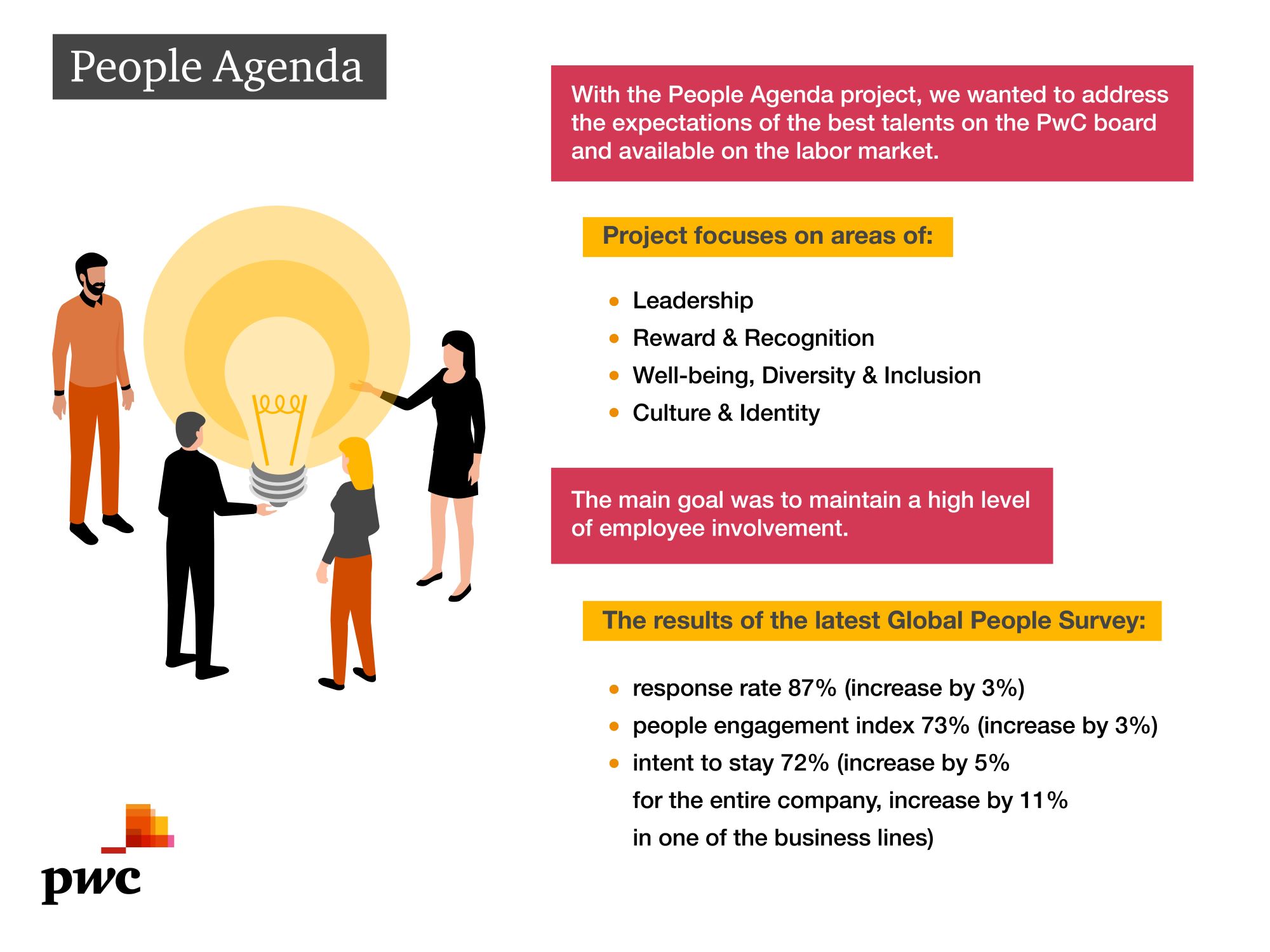 PwC Poland had recruited heavily, a move that has facilitated a massive average age reduction and increase in diversity. To integrate the company, it introduced a new employer brand that helped lead and engage employees across all demographics. With the 'People Agenda' project, they wanted to address the expectations of the best talents present on the PwC board and available on the labour market. A high level of employee involvement was achieved, exceeding goals and expectations.